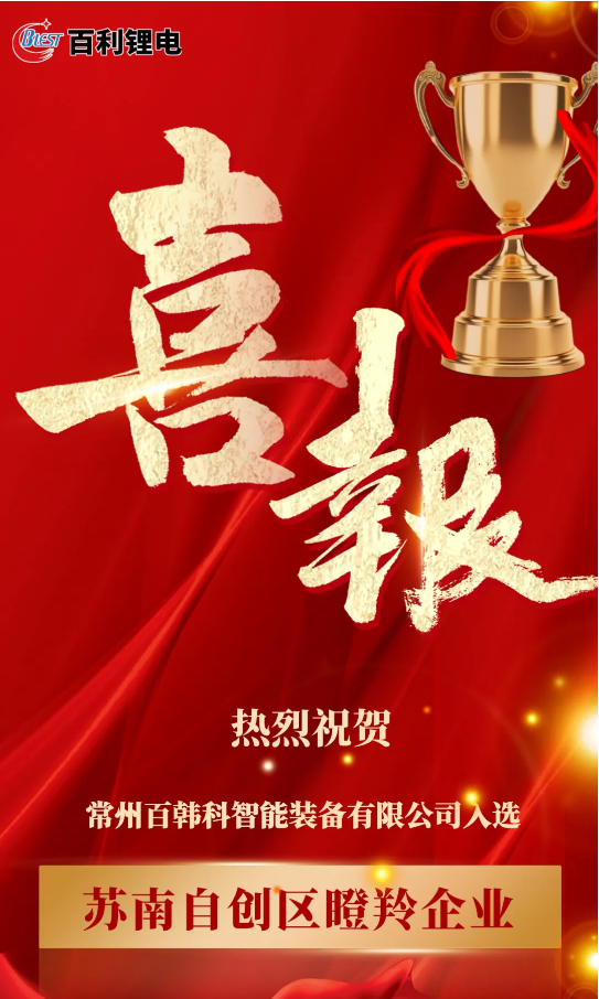 江蘇省生產(chǎn)力中心發(fā)布了2023年江蘇省獨(dú)角獸企業(yè)、潛在獨(dú)角獸企業(yè)和蘇南自創(chuàng)區(qū)瞪羚企業(yè)評(píng)價(jià)結(jié)果,百利鋰電旗下子公司常州百韓科智能裝備有限公司入選“蘇南自創(chuàng)區(qū)瞪羚企業(yè)”!